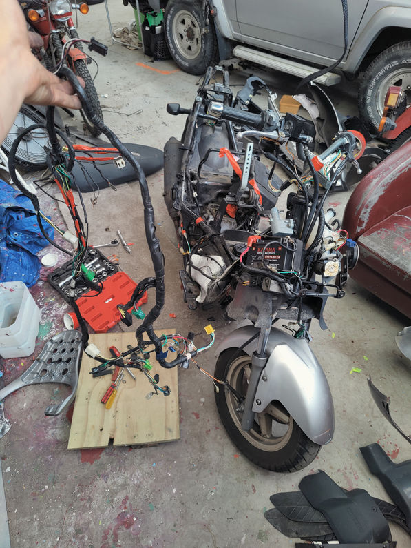 Replacing the wiring harness and re-painting a maxi scooter after fire damage.